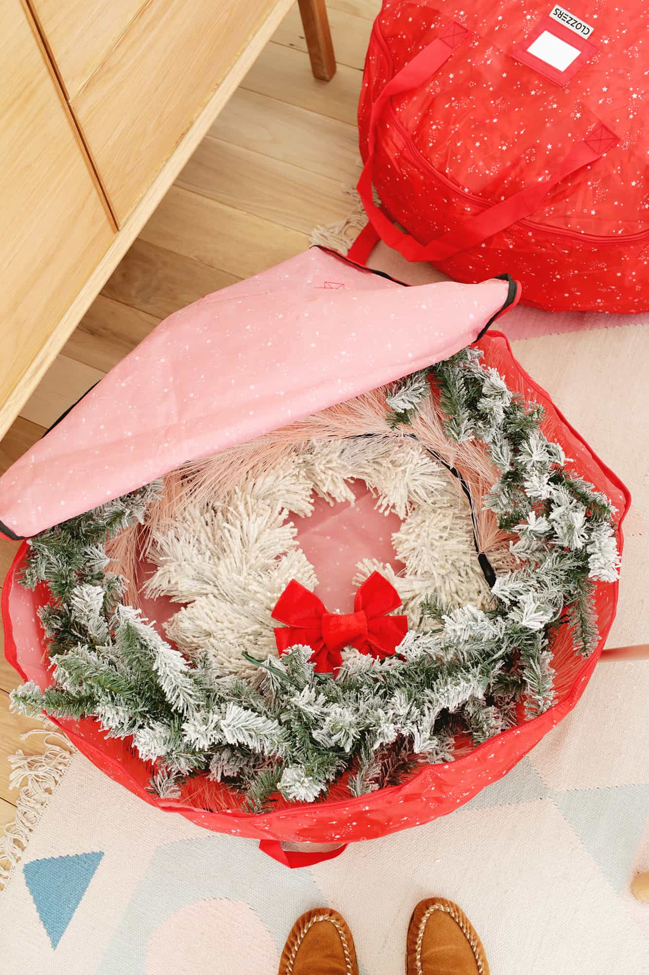 A wreath bag like this will keep them round, and you can store your garlands in there as well! I put my wreath in first, coiled some larger garlands around the outside edge, and then filled the middle with super lightweight tinsel garlands from the tree.