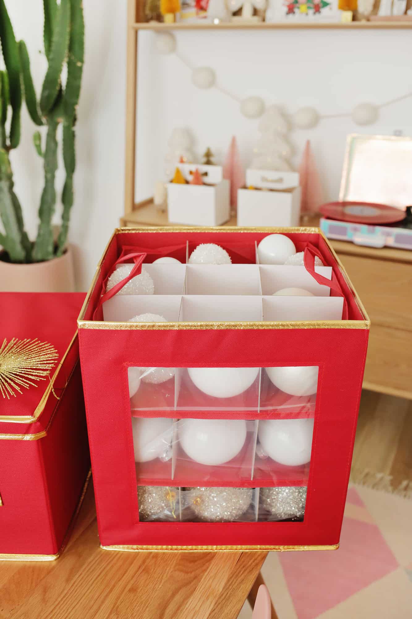 For items like ornaments, use a segmented storage option where there are lots of little compartments to keep your ornaments separate and safe during storage.