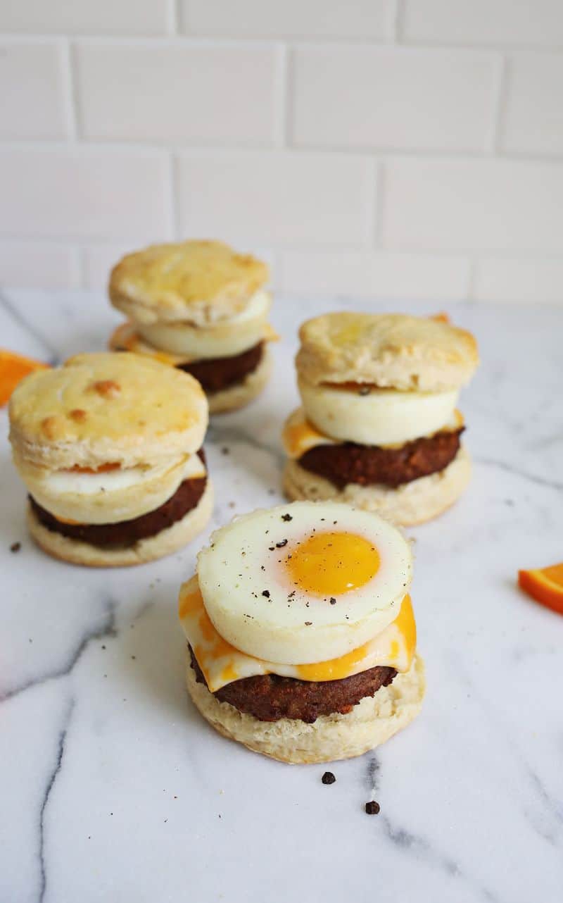 The biscuits are flaky and easy to make. I’m currently loving veggie sausage and cheese, but you could add bacon or arugula—whatever you prefer. And then it gets topped with a baked egg.