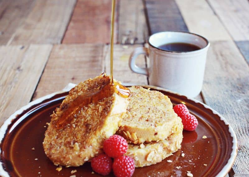 Another variation I love is crunchy French toast. This is something we made growing up, where you add crunched up breakfast cereal, like Honey Bunches of Oats, to the outside. Try it, it’s so good!