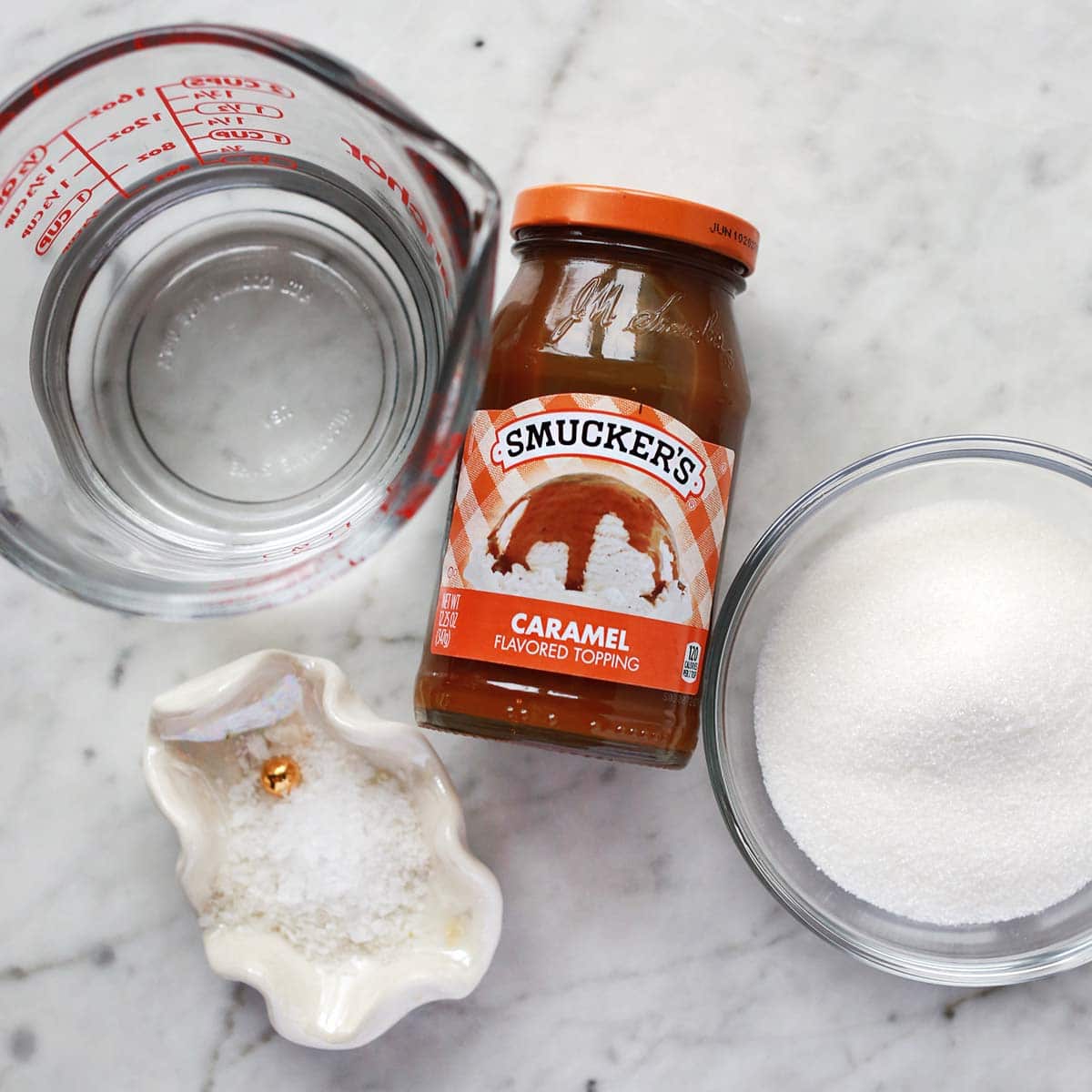 In a small pan, combine the sugar and water. On medium heat, simmer together and stir until sugar is fully dissolved and there are no grains. Then stir in the caramel sauce, whisking until full dissolved.