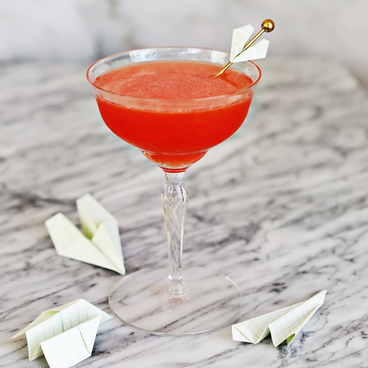 - Pour into a chilled coupe glass. Garnish with a tiny paper plane or an orange twist.