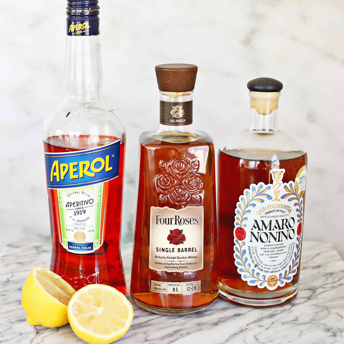 - In a cocktail shaker half filled with ice cubes, pour in bourbon, Aperol and Amaro Nonino. Then add freshly squeezed lemon juice.