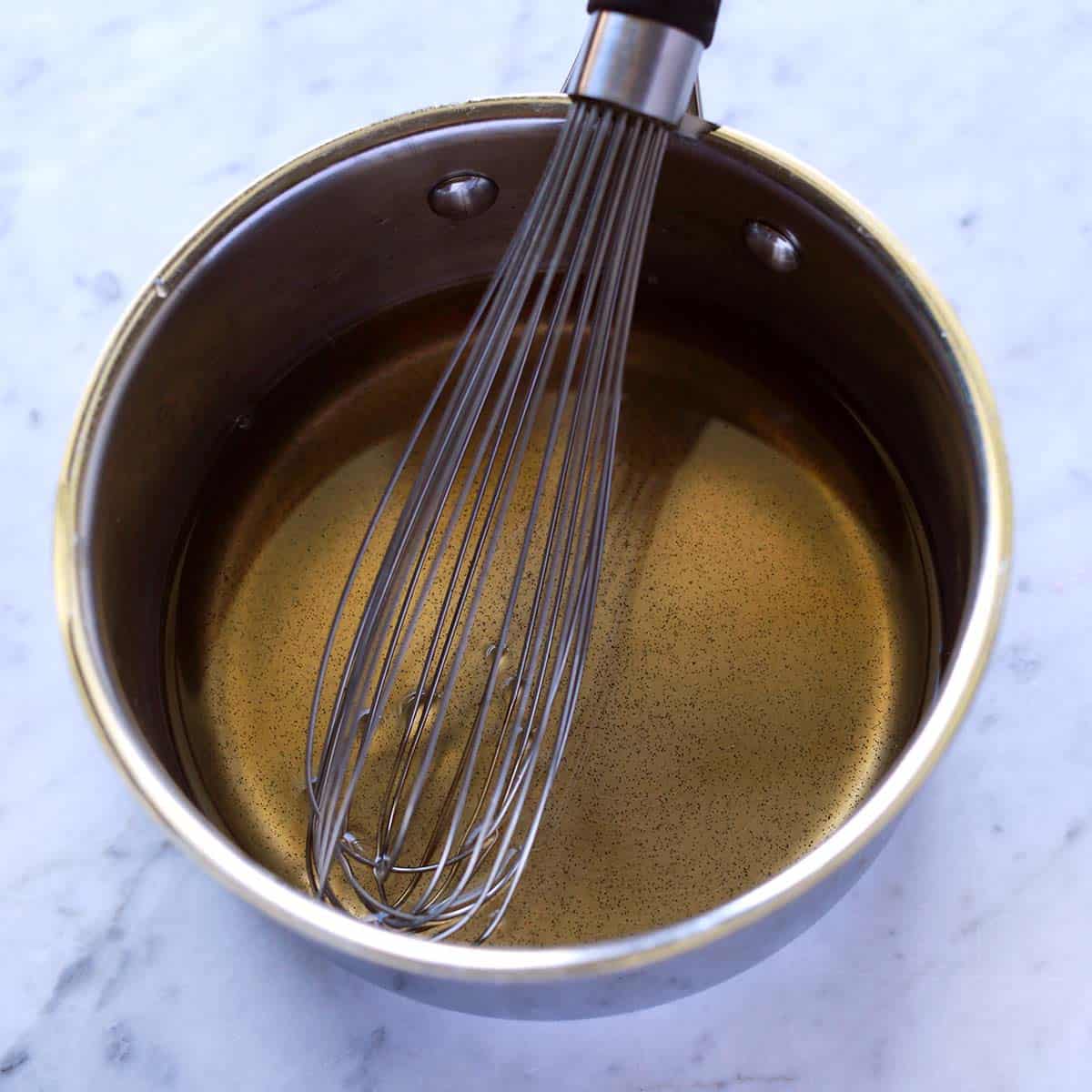 - Over medium/high heat whisk the sugar until it’s fully dissolves. The water should get hot during this process but you do not need to reach a boil.