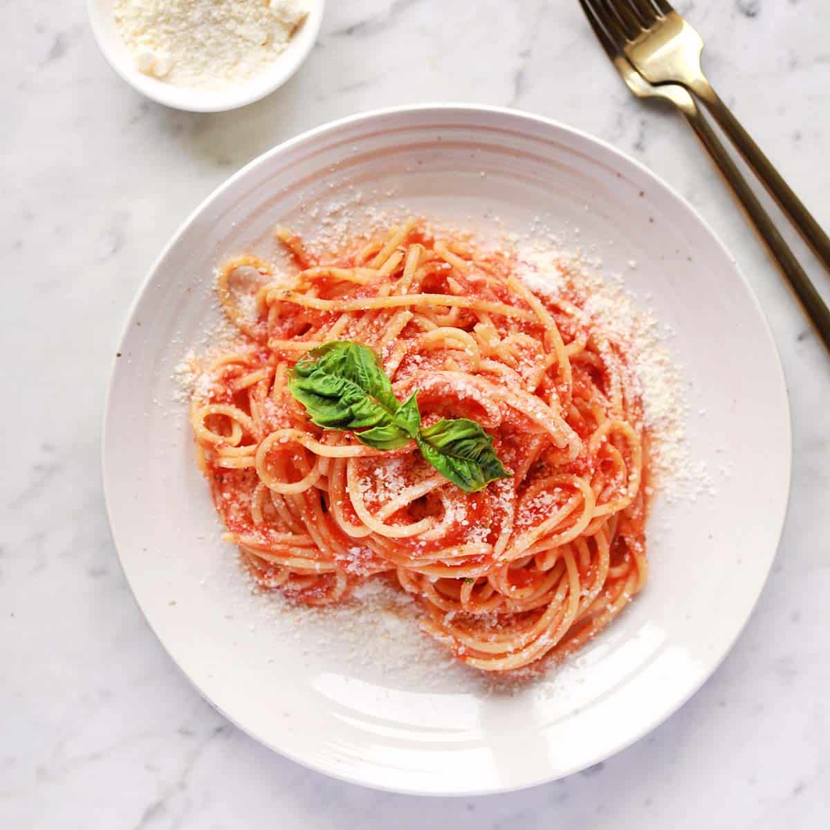 This is my go-to tomato sauce recipe when I’m making it at home and not just buying a jar of store-bought. Pomodoro sauce simply means tomato sauce in Italian. It’s a simple recipe that tastes super fresh and flavorful. I also like that you can keep this sauce recipe traditional or you can easily customize it to your preferences, like adding some red pepper flakes or other ingredients that fit what your family loves.