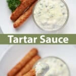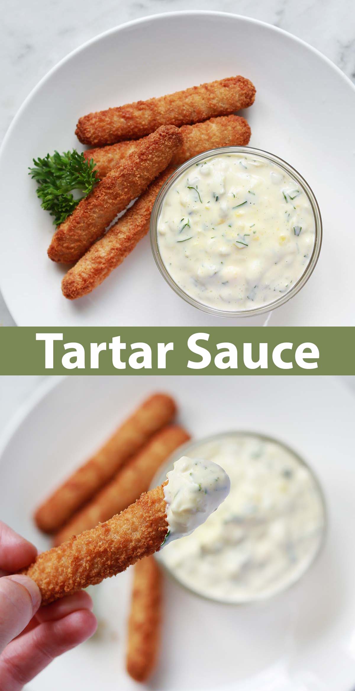 Tartar sauce is a creamy mayo-based sauce flavored with dill pickles (or relish) and a few fresh herbs. I like my tartar sauce more on the dip-side, not so thick that you have almost scoop it. But, that’s the great thing about making your own—you can easily customize this to your preferences.