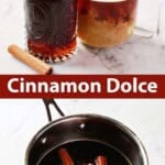 This homemade cinnamon dolce syrup is a Starbucks copycat recipe but also, it’s how I like it. Which I think is one of the biggest benefits of making your own vs buying something store-bought; you can customize it to your taste. This cinnamon simple syrup is sweet, spicy and balanced with vanilla—perfect for seasonal lattes or cocktails.