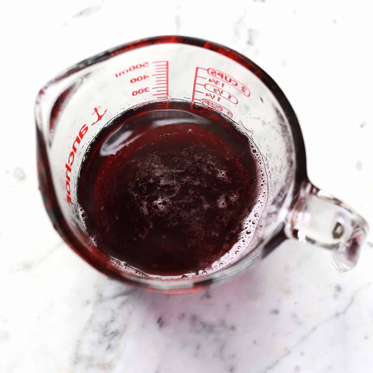Pour the mixture through a fine mesh sieve into a glass mixing cup with a spout. Use a spoon to fresh the cherries into the sieve, to get as much liquid out as you can.