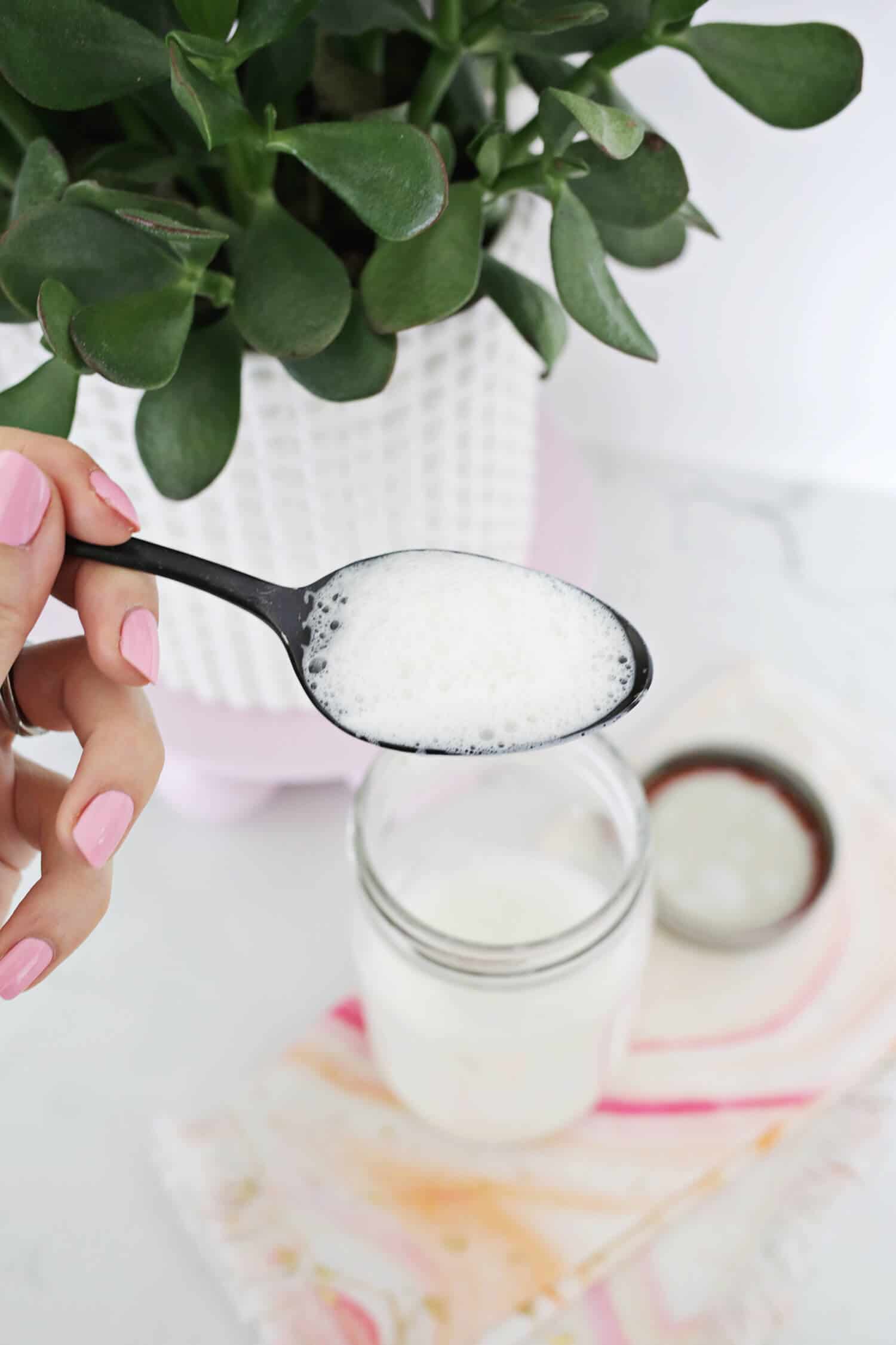 Warm the amount of milk you want to use on the stovetop or in the microwave and pour into the jar. You’ll want a size jar that’s no more than halfway full when you add your milk so you have room to create bubbles.