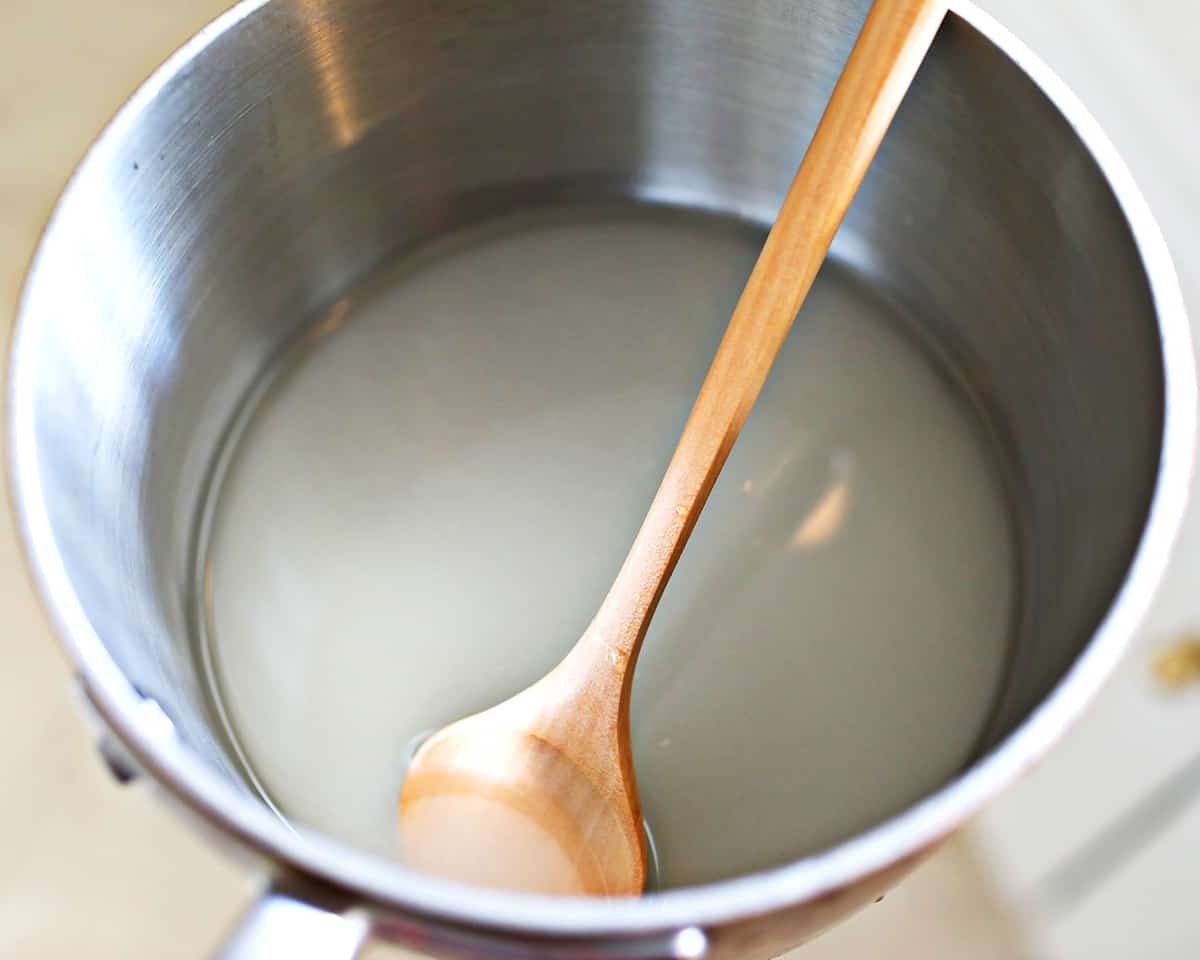 - On medium heat, simmer together and stir until sugar is fully dissolved and there are no grains visible.