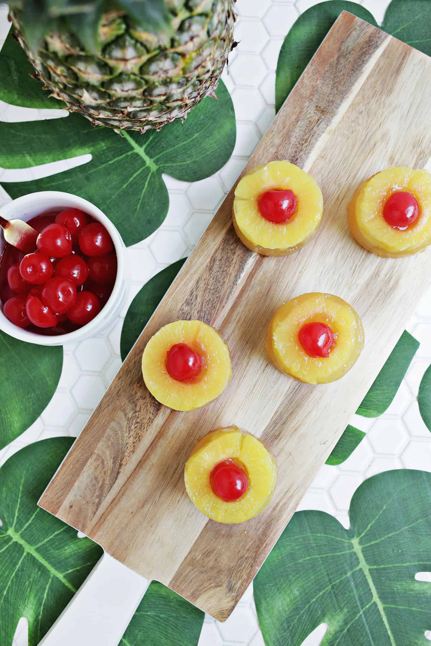 Cut a smaller circle in the middle of the pineapple for the cherry (or you can use circle cutters too) and bake your pineapple slices for 3 minutes in the microwave (or cook them for a few minutes in the oven).