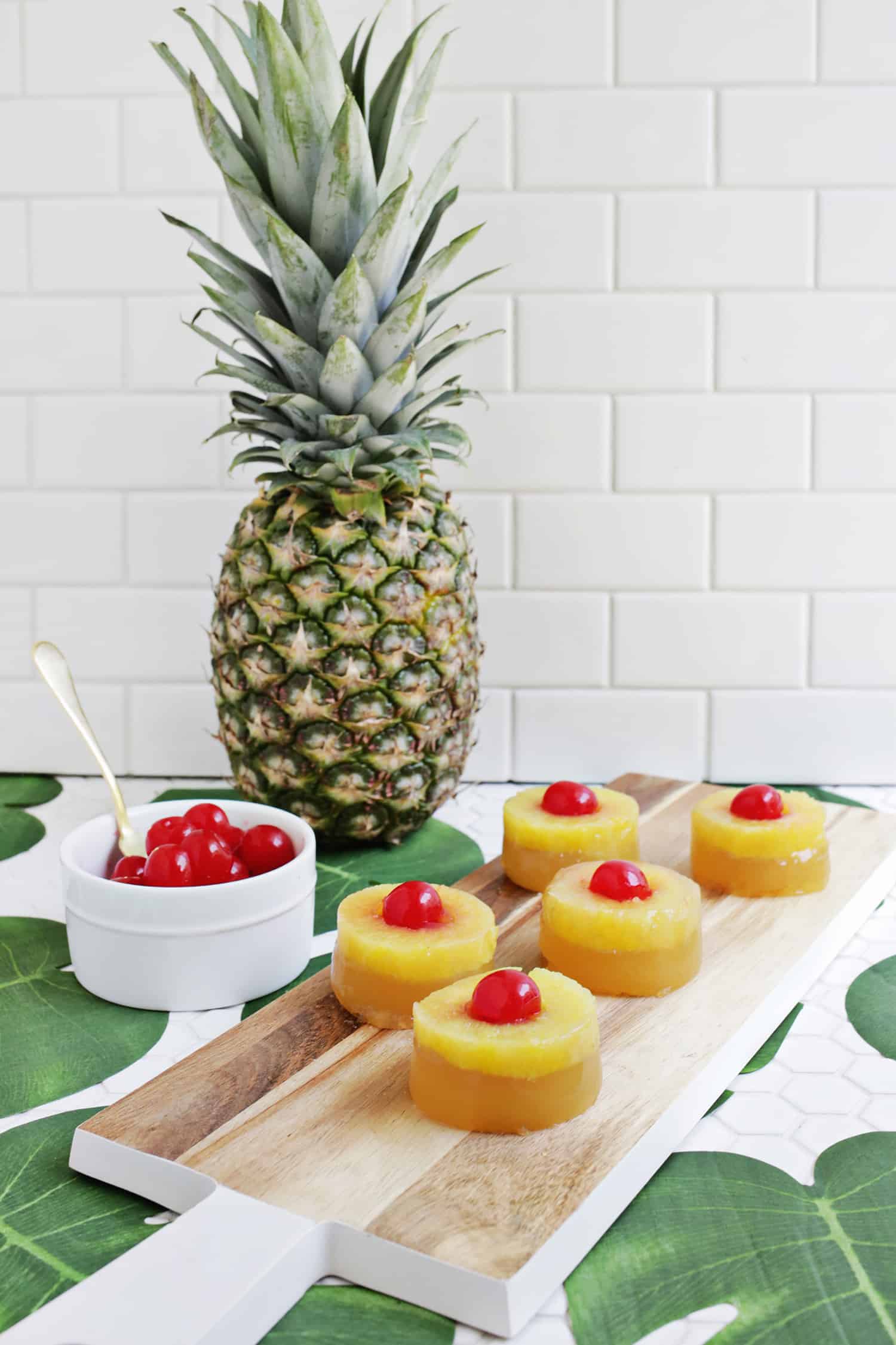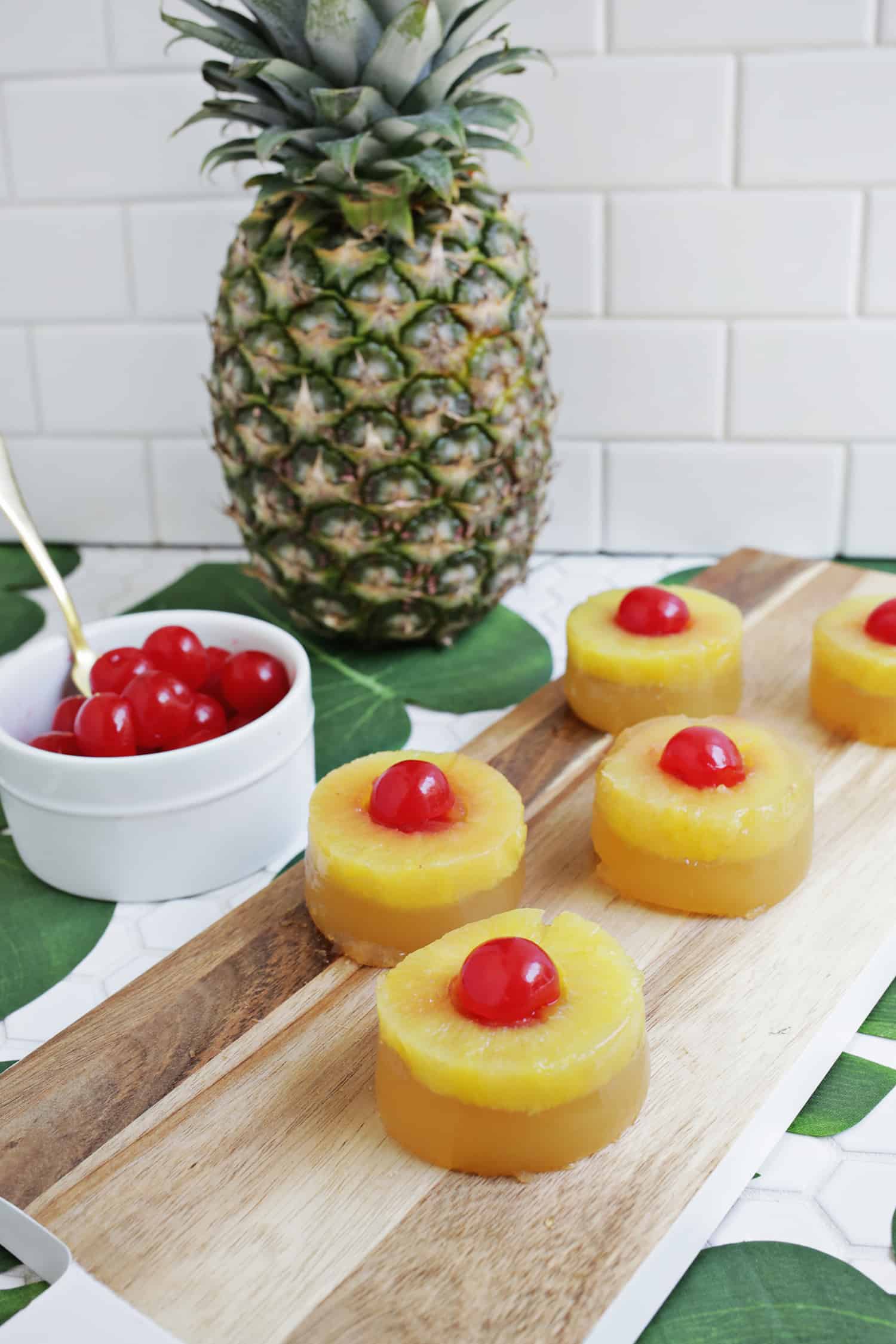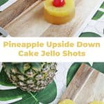 One of my favorite things to do is to make fun jello shots and I’ve got a great one for you today! I was thinking how pretty the top (or technically the bottom) of a pineapple upside down cake is and it dawned on me that it would be the perfect method and flavors for a jello shot, too.