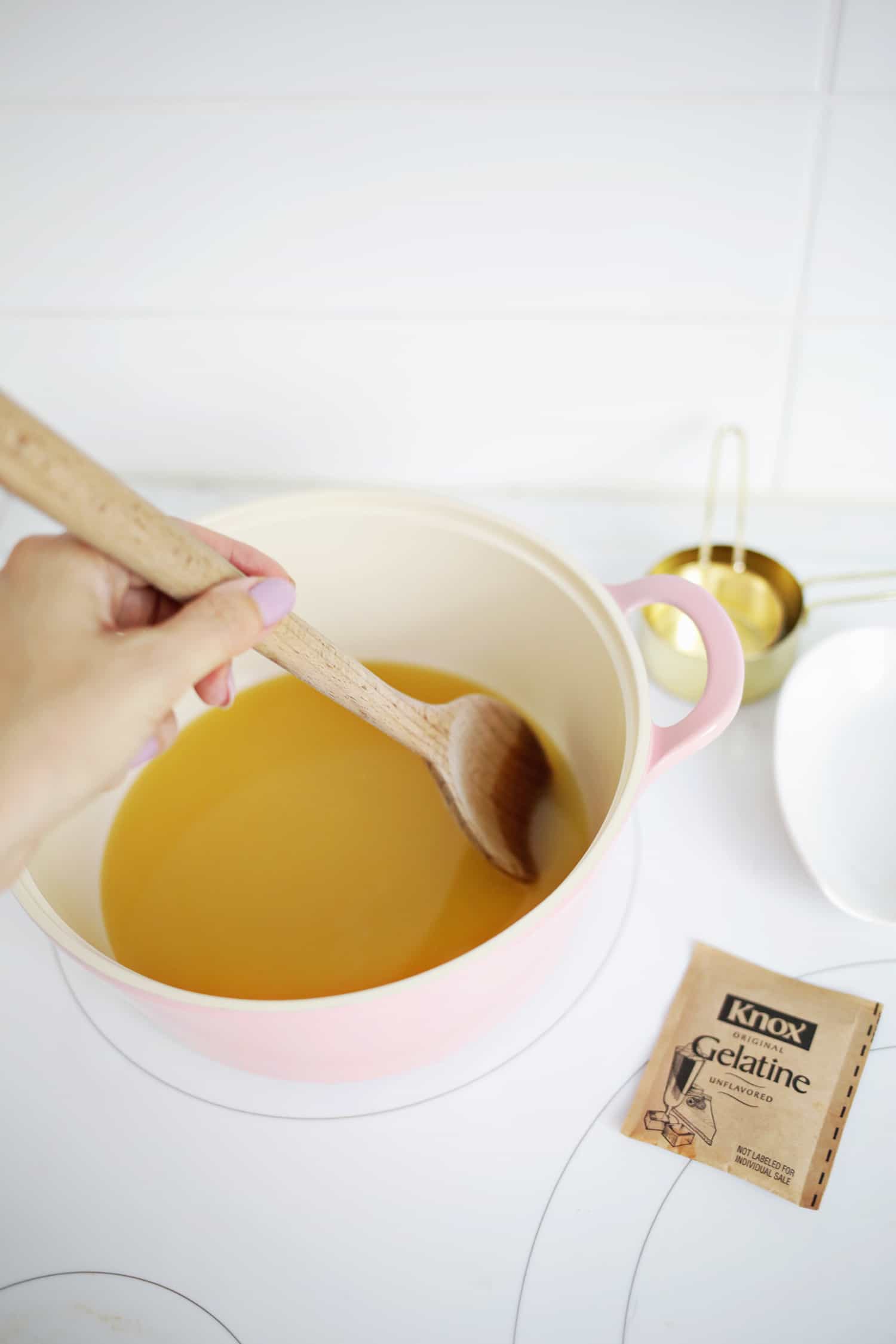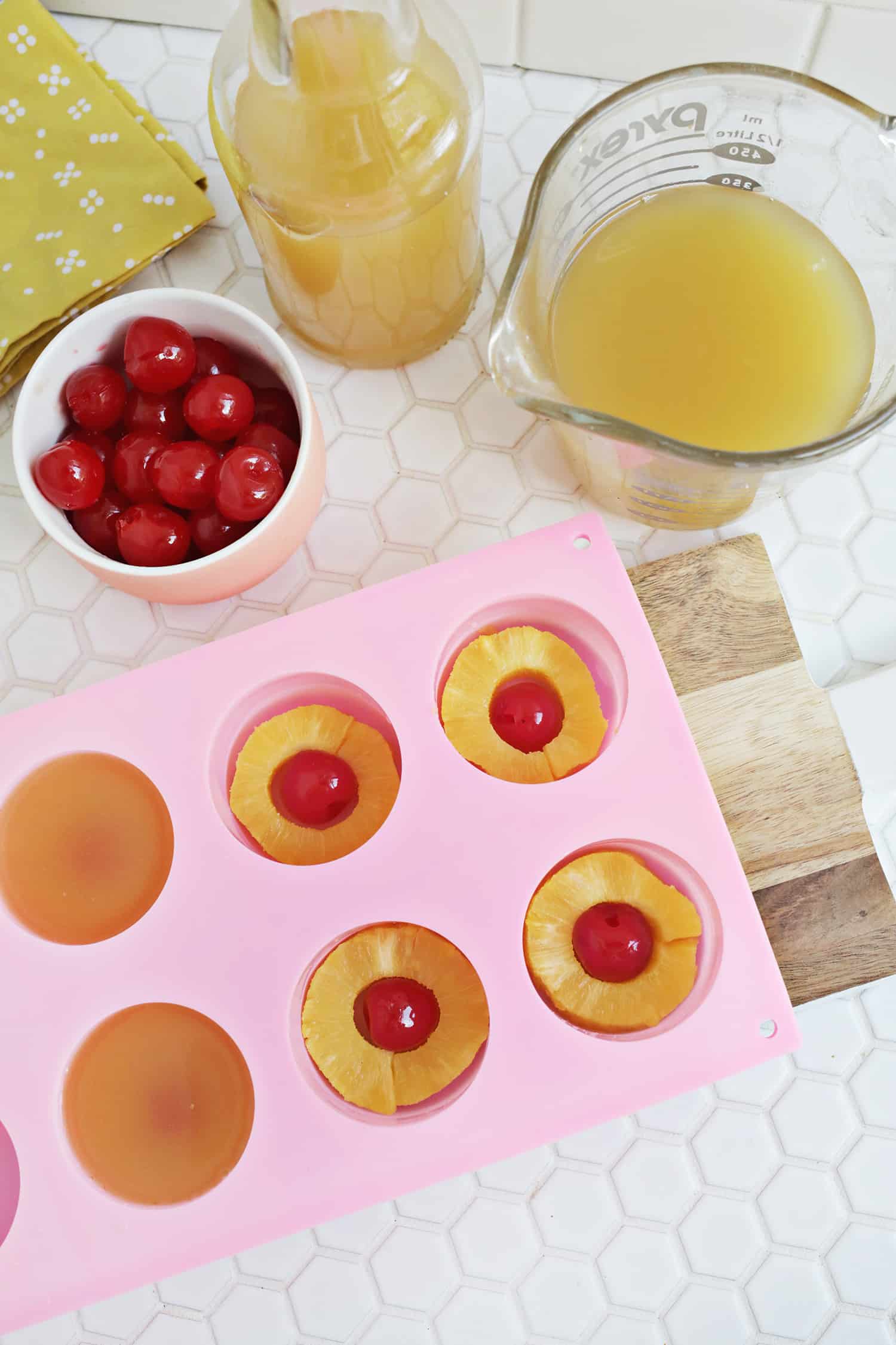 I didn’t know this, but apparently raw pineapple doesn’t play well with gelatin (it has an enzyme called bromelain that breaks up the gelatin), so you have to cook your pineapple rings first so they stay nice and pretty—news to me!