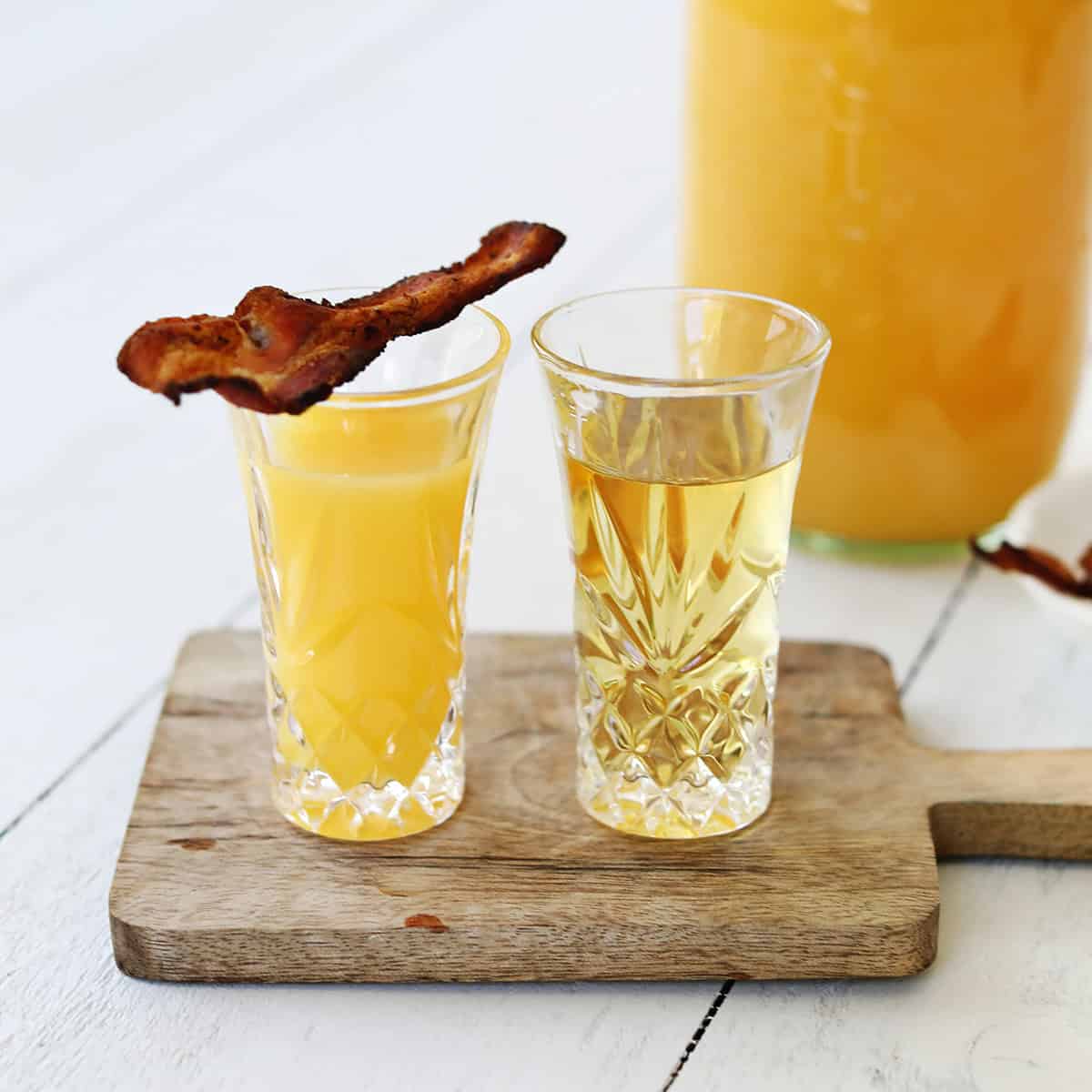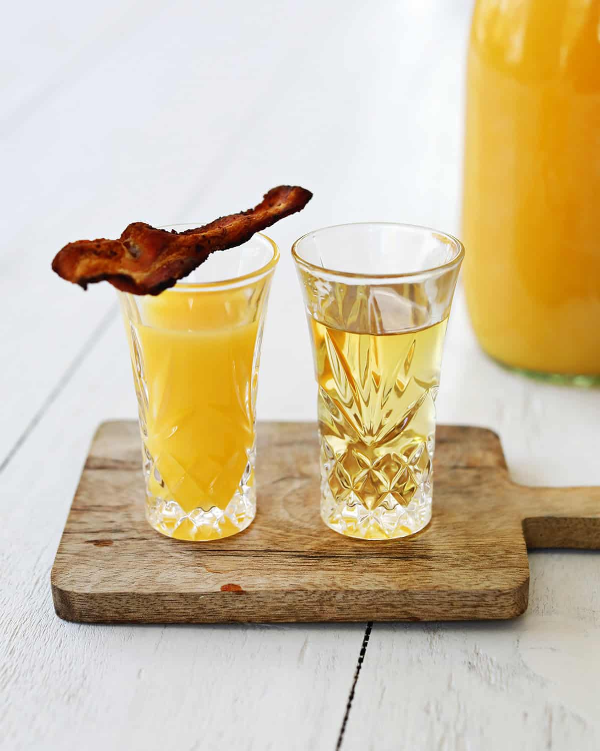 - Pour orange juice into one shot glass, and garnish with bacon.