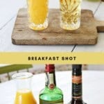 The Breakfast Shot (also called the Irish Breakfast Shot and a McGriddle Shot) is the perfect recipe to serve for breakfast during a fun weekend with friends. It’s made with Irish whiskey, butterscotch schnapps, orange juice and a bacon garnish. This recipe is often served as a double shot, the orange juice is its own shot and can be used as a chaser.
