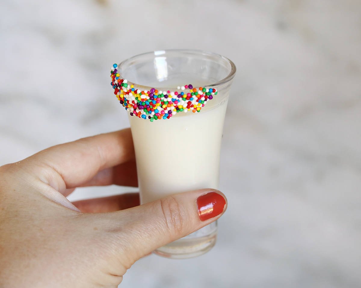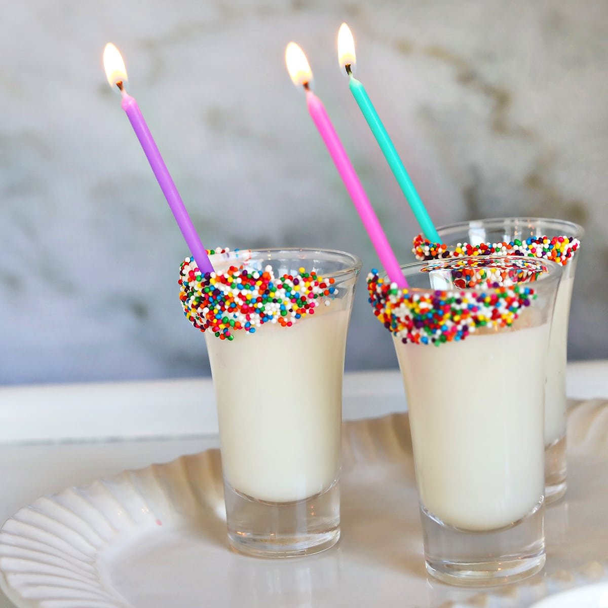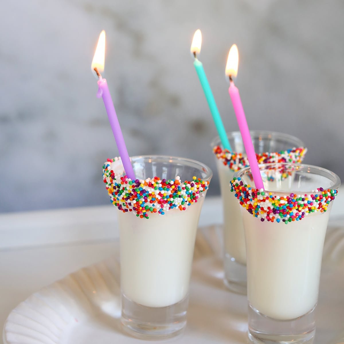 For this delicious shot recipe, I used these tall birthday candles, nonpareil sprinkles and these shot glasses.