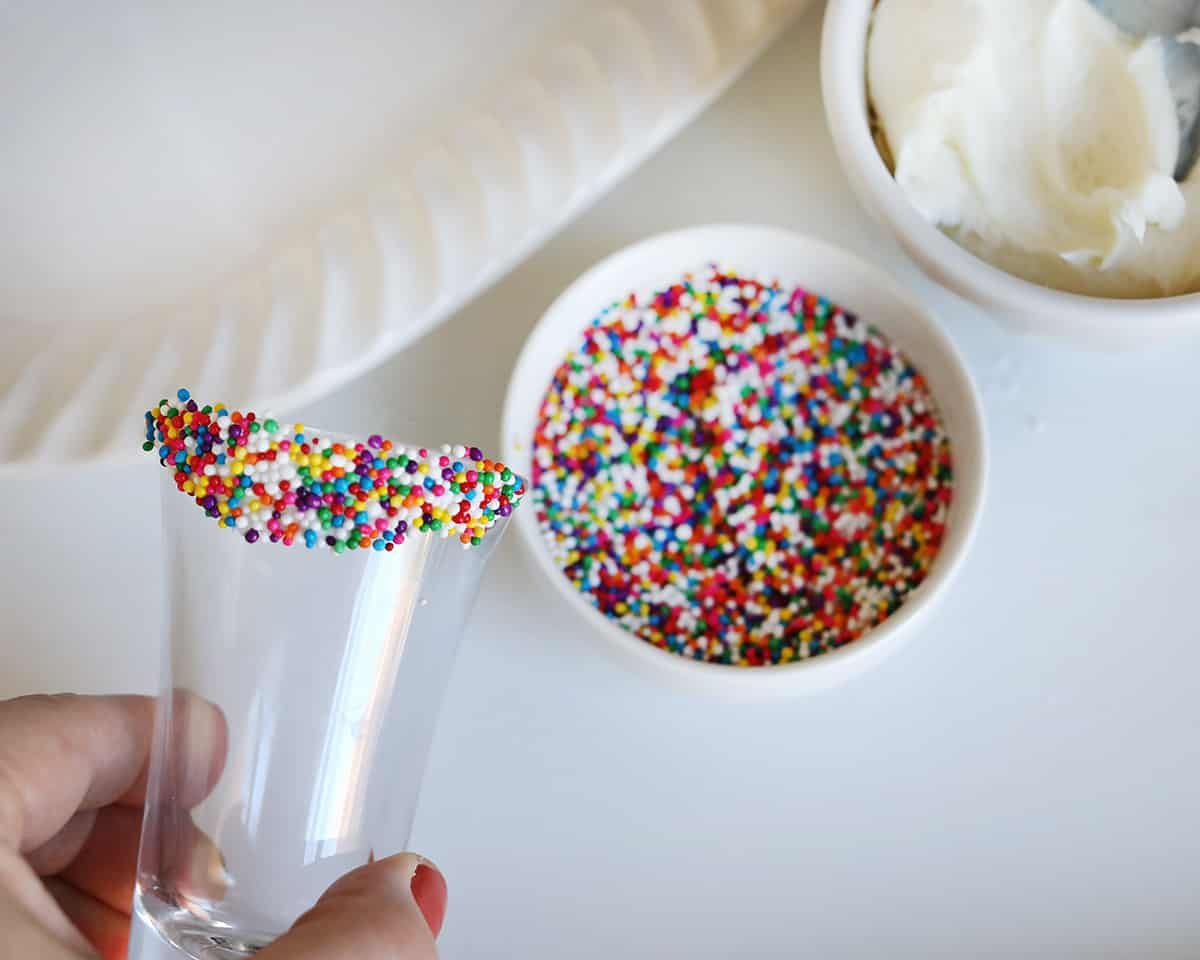 - Begin by prepping the rim of your shot glasses. Smear a little icing on the outer edge around half of each glass. Next, roll the iced part into sprinkles until they are completely covered.
