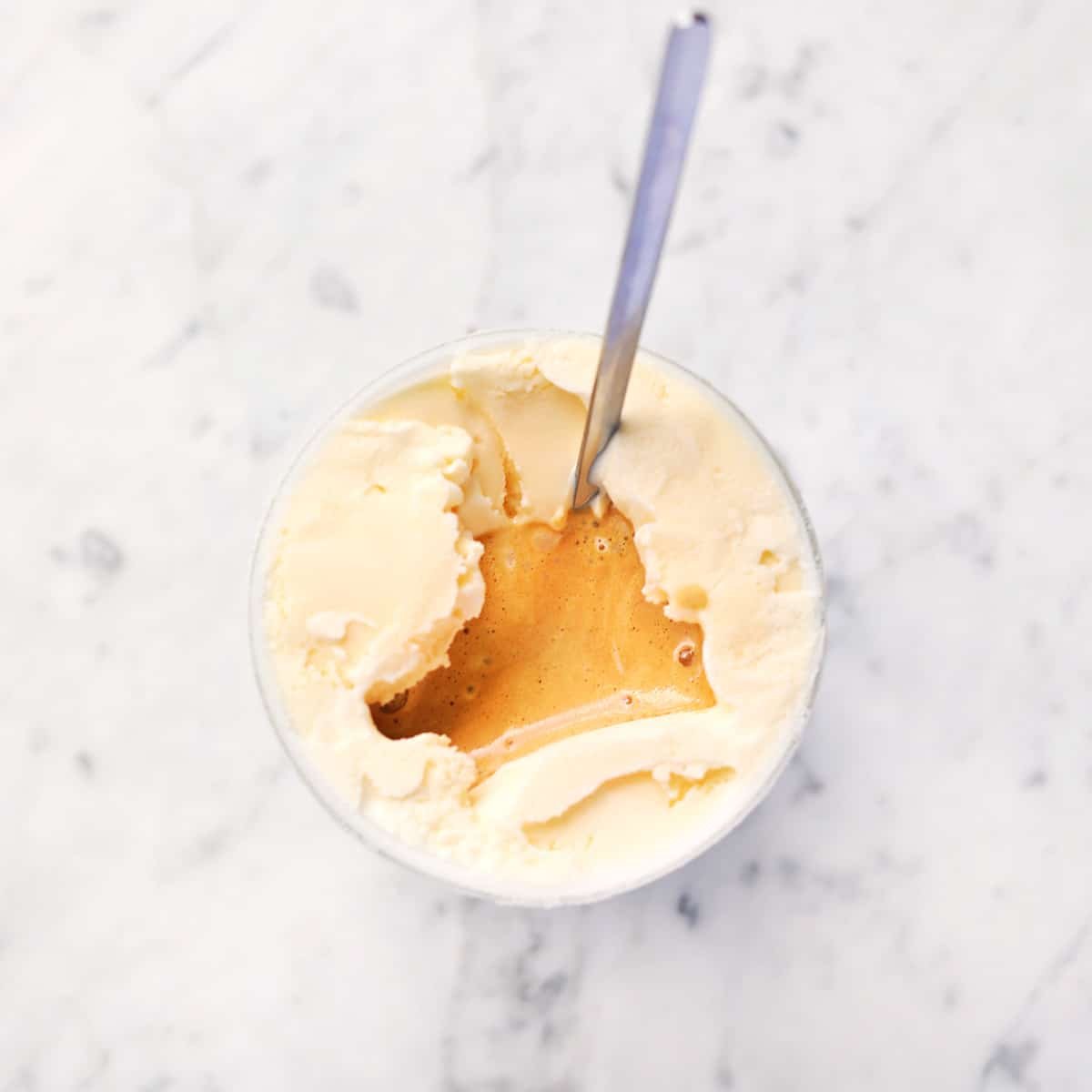 In a cup or small bowl, add a scoop or two of ice cream. To me this is a good ratio for one shot of espresso.