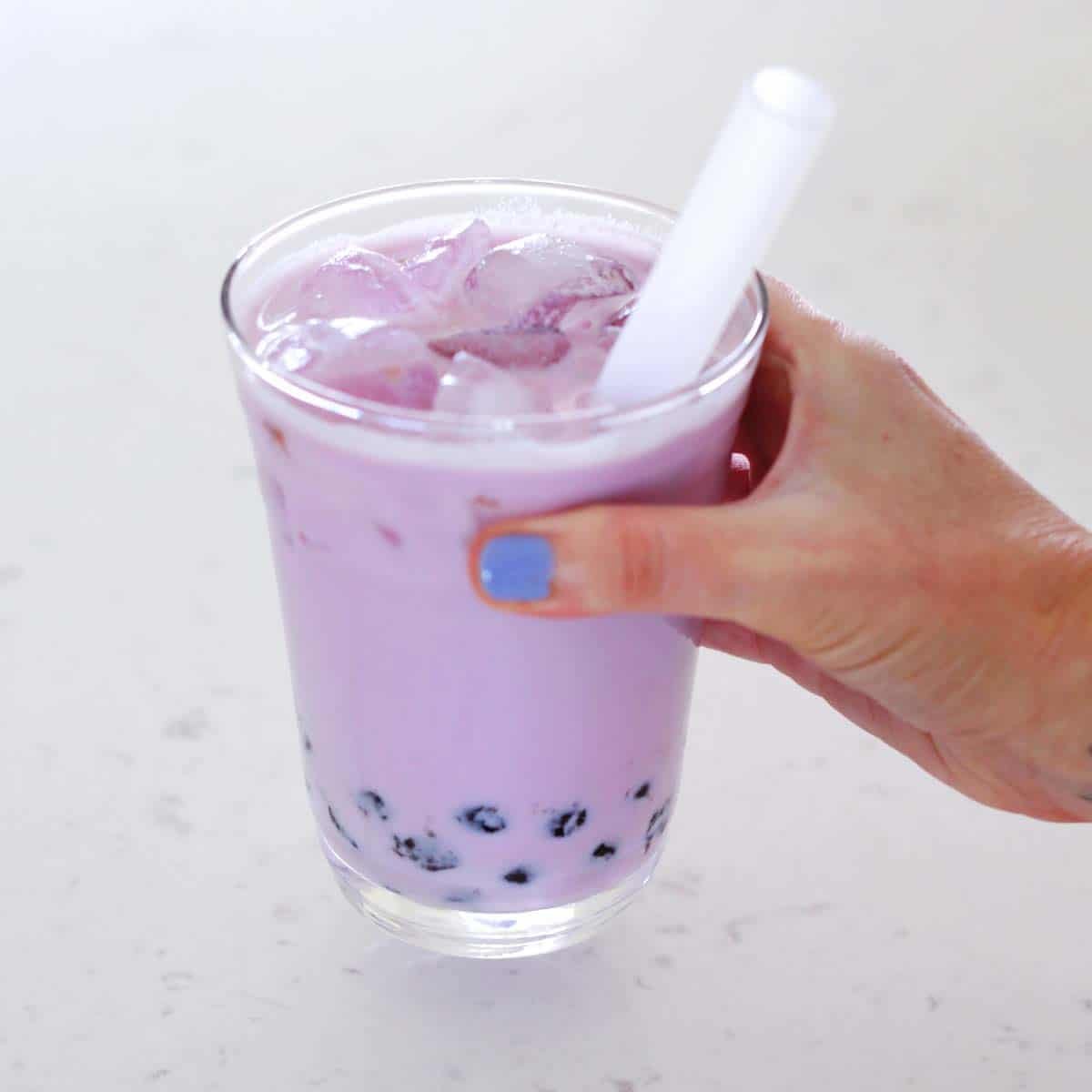 Taro milk tea is one of the most popular bubble tea drinks I usually see on menus. While of course you don’t have to add boba pearls to taro milk tea, it’s more fun if you do. 🙂 This drink is a vibrant purple lavender color and made with taro root, brewed tea, and milk.