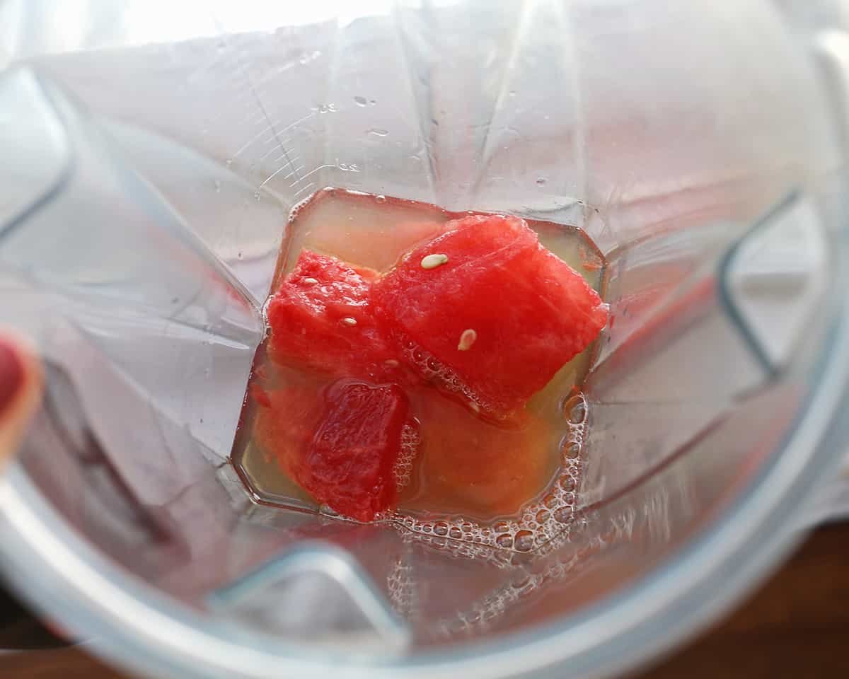 - In a blender, blend fresh watermelon pieces and lemon juice together. Use a fine mesh strainer to remove the pulp.
