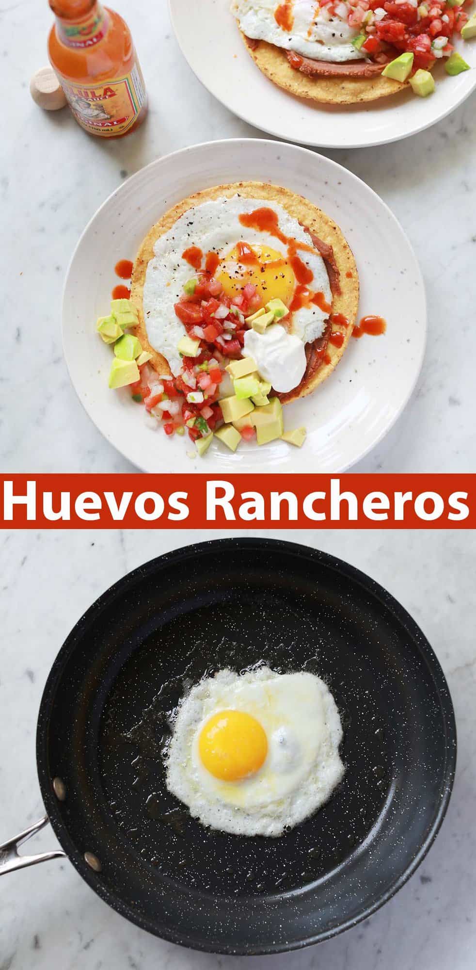 This huevos rancheros recipe is how I like to make it; which is a bit more Tex-Mex style. I like to use tostada shells, which are crispy corn tortillas. It’s like a giant tortilla chip. If you can’t find them simply make your own by frying a corn tortilla. But I like the crunchiness paired with the fried egg (runny yolk). I also top mine with either refried beans or black beans. This makes the meal a little more filling but still a vegetarian friendly breakfast.