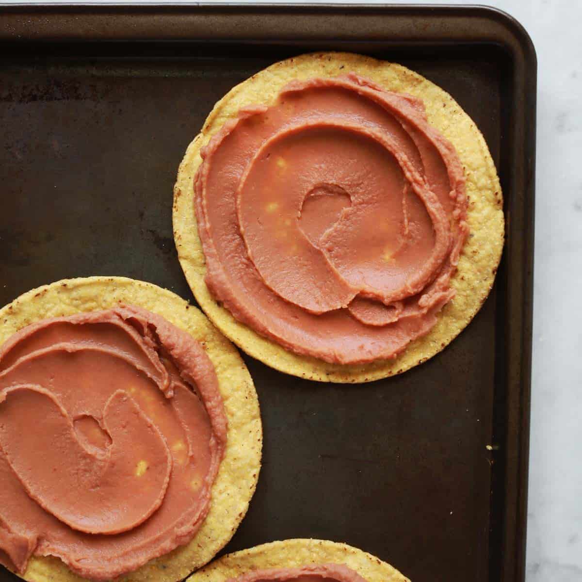 - Spread the refried beans in a thin layer over the tostada shells.