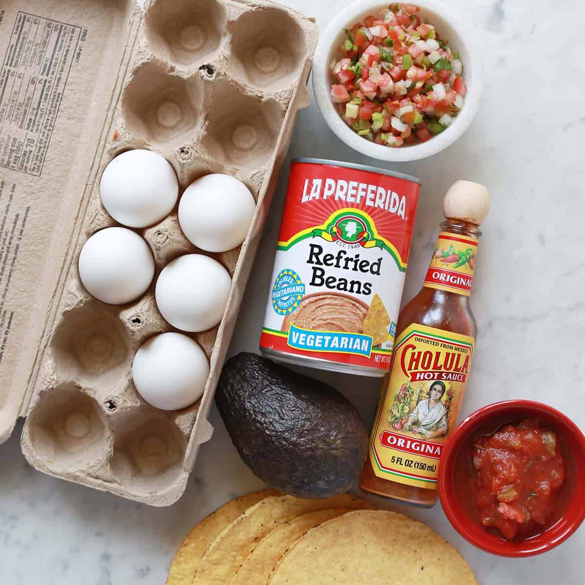 Top the warmed tostadas with the eggs. Then add your other toppings like salsa, pico de gallo and fresh avocado. Sprinkle with a salt and pepper or add some hot sauce. Serve warm.