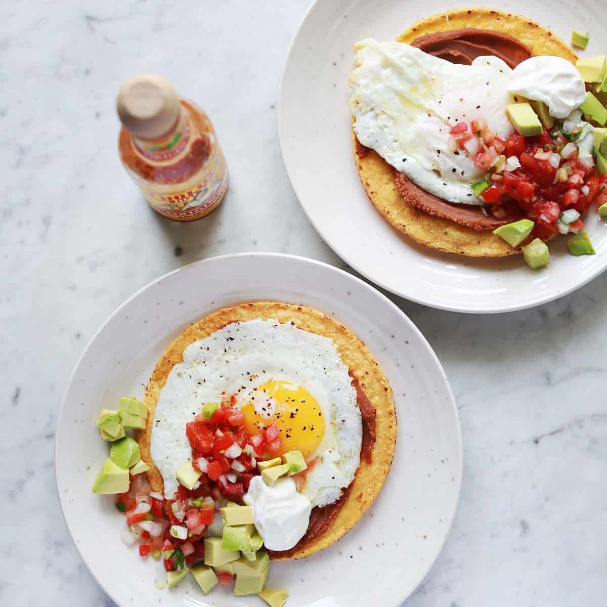- Top the warmed tostadas with the eggs.