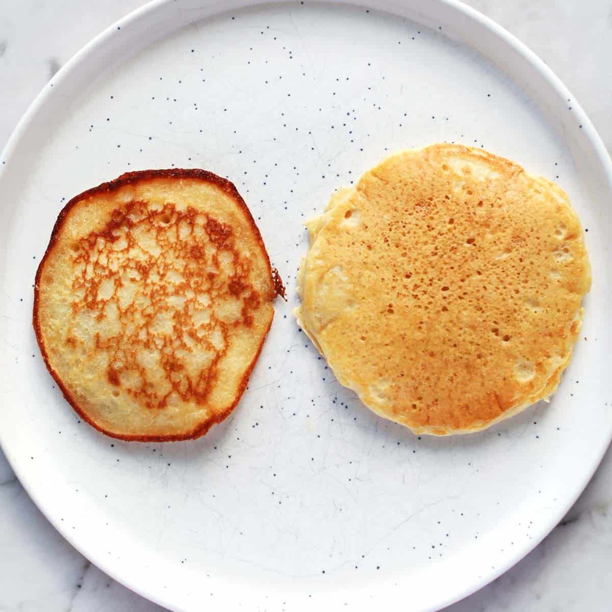 Stove top works just fine too! I grew up with pancakes made this way, which is more pan fried, so it holds some nostalgia for me. I love the crispy edge it produces from the melted butter and oil in the hot pan. The crispy edge paired alongside the fluffy interior is how I defined pancakes growing up, so this method will always get an A+ from me. 🙂