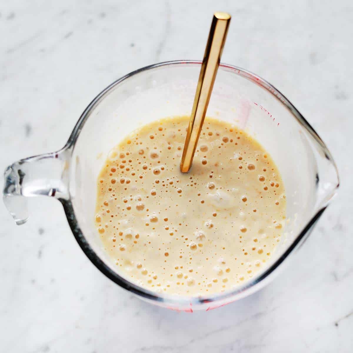 - Then stir in the wet ingredients: milk, vanilla extract, large egg and two tablespoons of melted butter. The batter should be cohesive but it doesn’t have to be 100% lump free.