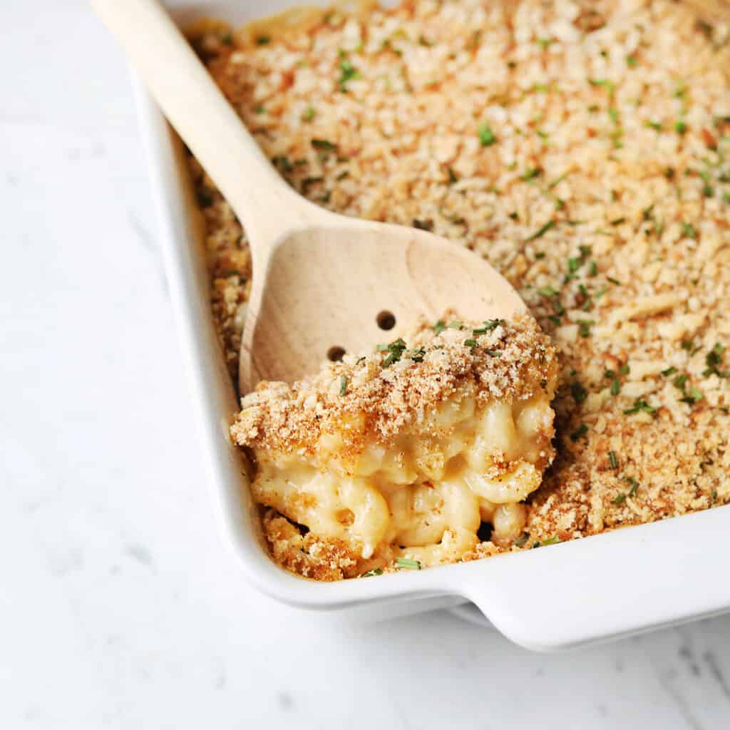 This is a classic baked macaroni and cheese recipe with no eggs or evaporated milk. It’s creamy, delicious and can be prepped in advance.