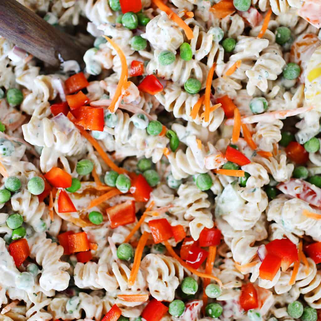 A creamy, mayonnaise-based pasta salad recipe. Pasta salad is perfect for a spring party.