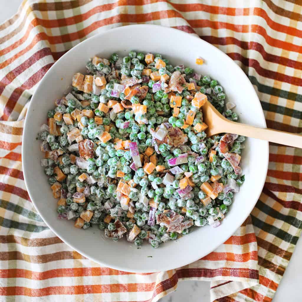 An easy to make mayonnaise-based pea salad to serve at your next family lunch.