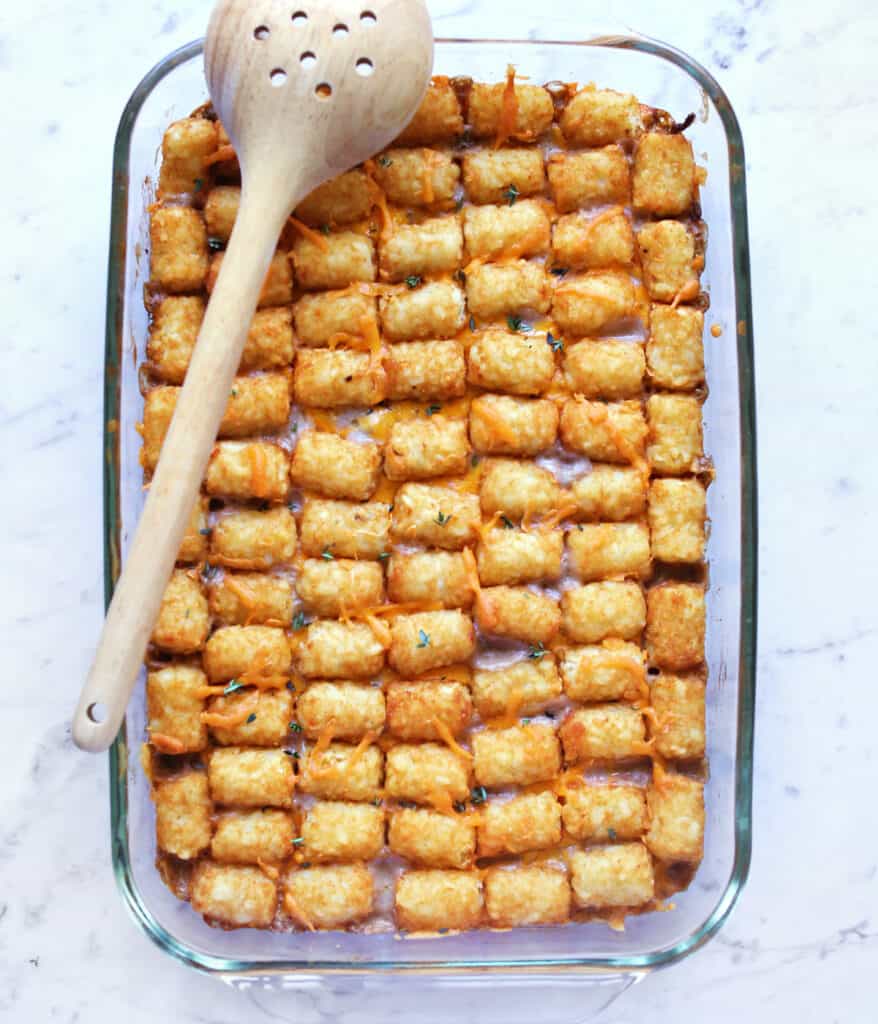 A simple five-ingredient casserole with frozen tater tots on top. This brunch recipe can be prepped the night before.
