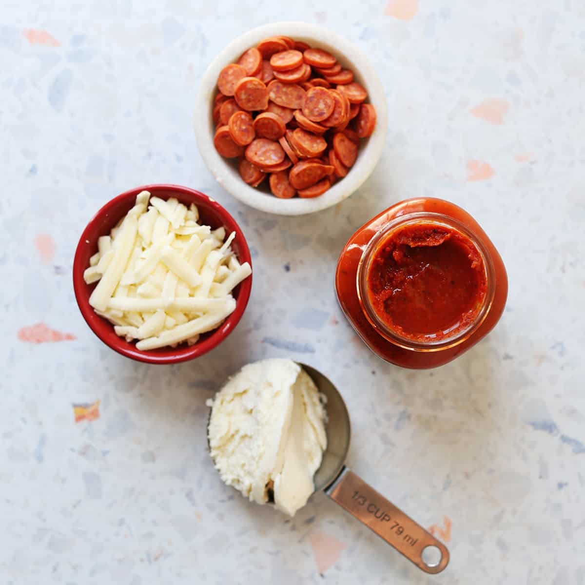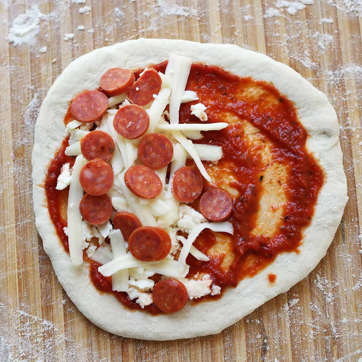 - Toppings – Pizza toppings can become fillings for calzone. My family likes pepperoni, and if I have some fresh basil, I’ll usually add that too. If you want to use vegetables, you may want to consider cooking them slightly first, like sautéing bell peppers, onions, or mushrooms. But this is personal preference and just depends on what kind of textures you prefer.