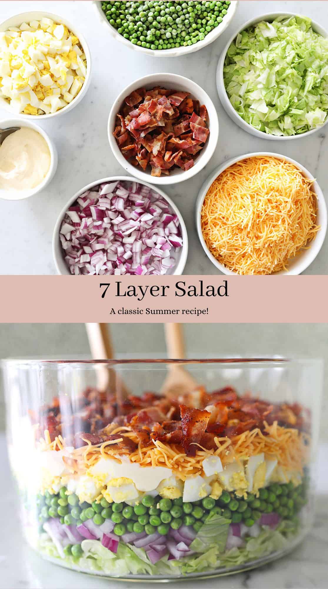 Seven Layer Salad is a delicious layered pea salad. This classic recipe has been around for generations. It’s delicious, fresh and best of all cold—perfect for summer! This salad is colorful, crunchy and creamy. It’s the perfect recipe for any warm weather gathering. The 7 Layer Salad is my favorite summer side dish.