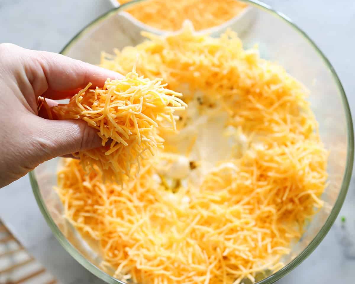 - Cheddar Cheese – Shredded sharp cheddar cheese is so delicious in this salad. Alternatively, you can add cubed cheese, but make sure you chop it small.