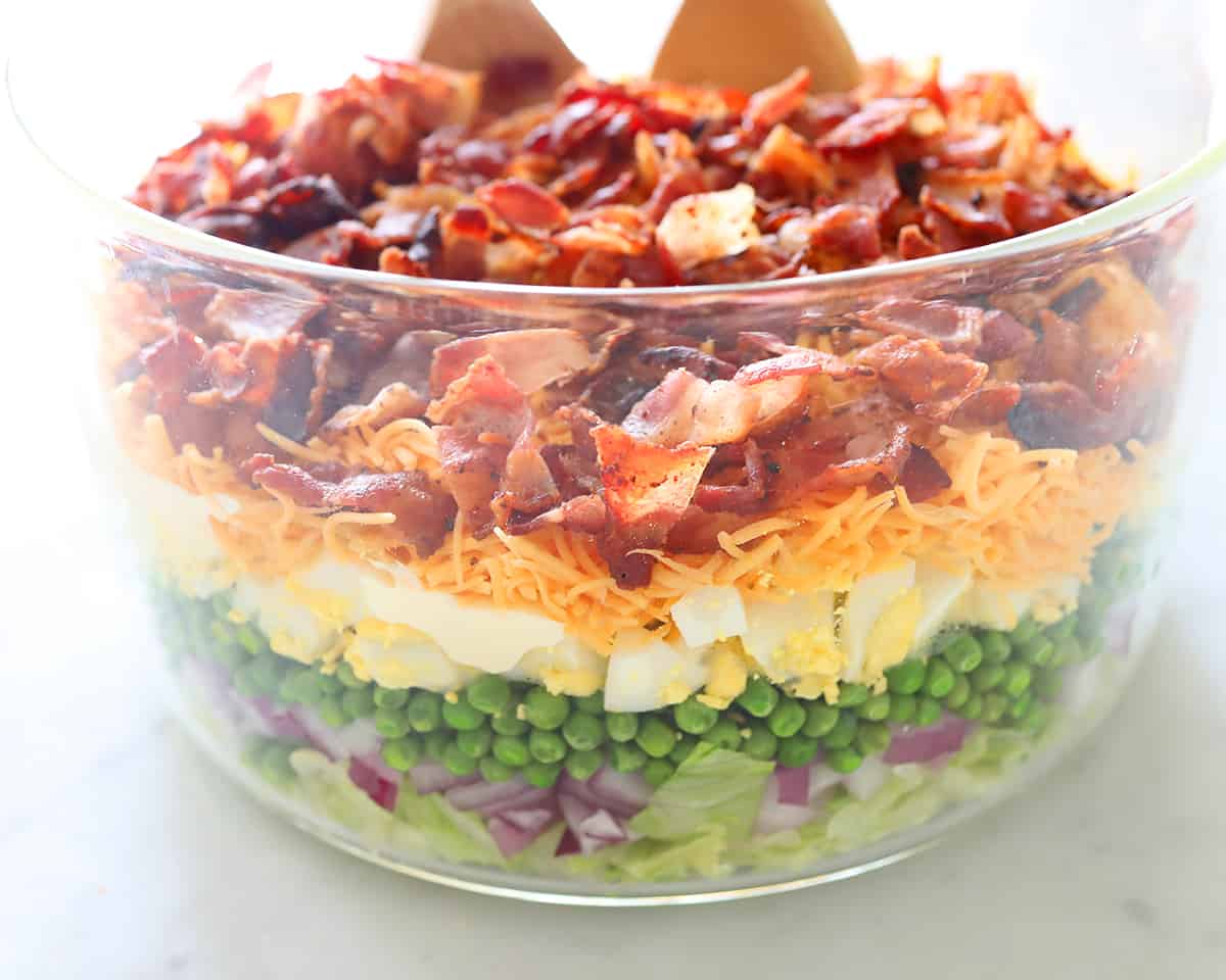 - The 7 Layer Salad must be served in a glass bowl so you can see all the layers. It’s a very visually pleasing salad. I chose this glass bowl because it shows the layers really well. The salad is meant to be served without mixing the layers, so people can scoop straight down and get a scoop of all the layers.