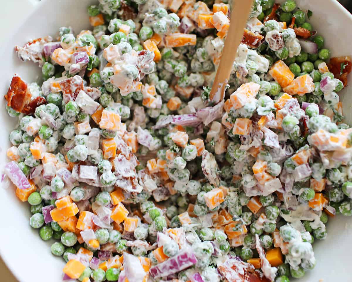 - Add peas, bacon, cubed cheese, onion and parsley. Stir to combine, making sure all the salad is coated with dressing.