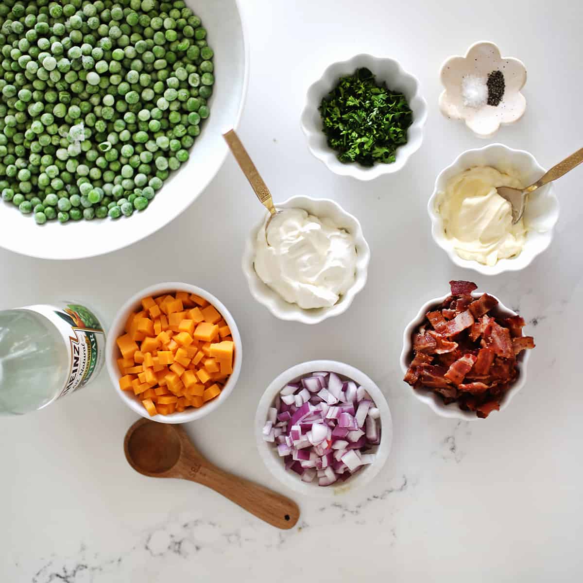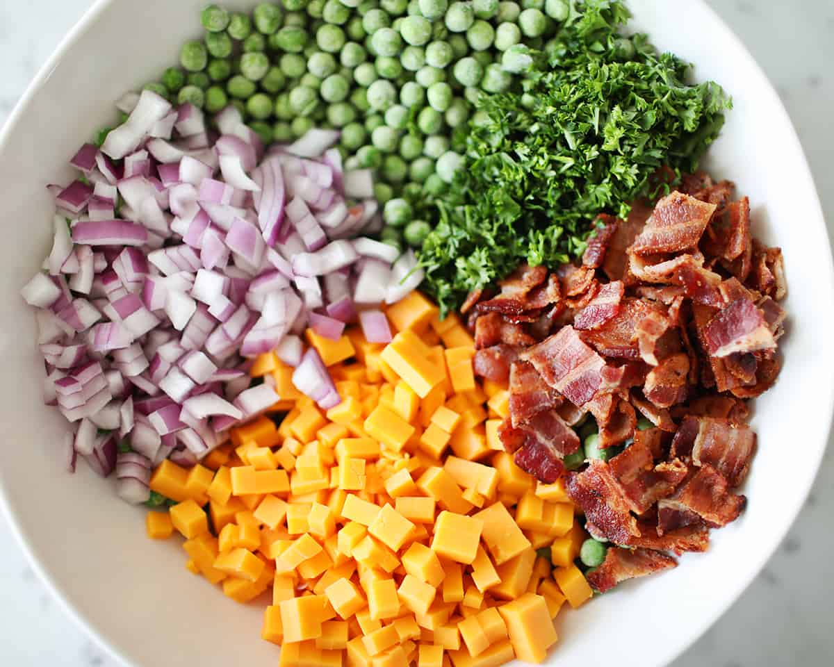 - Prep for this salad by cooking eight pieces of crispy bacon, chopping onion, chopping cheddar cheese and thawing peas.