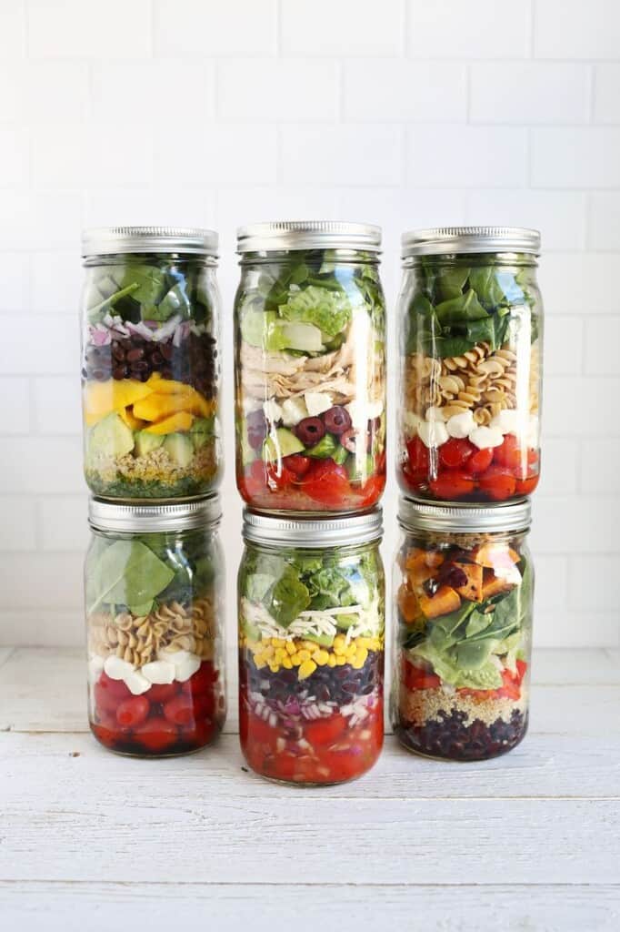 The main pros to the mason jar salad are twofold: first, you can make all your lunches for the whole work week in one sitting and your worries of what to eat everyday for lunch are already solved. These salads include black bean and corn, tomato and mozzarella, quinoa and sweet potato, and Greek chicken.