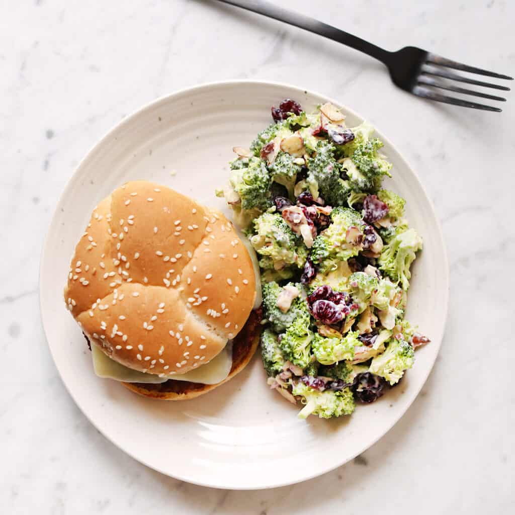 This broccoli salad is crunchy, creamy, and flavorful. All you need is broccoli, cranberries, and almonds.