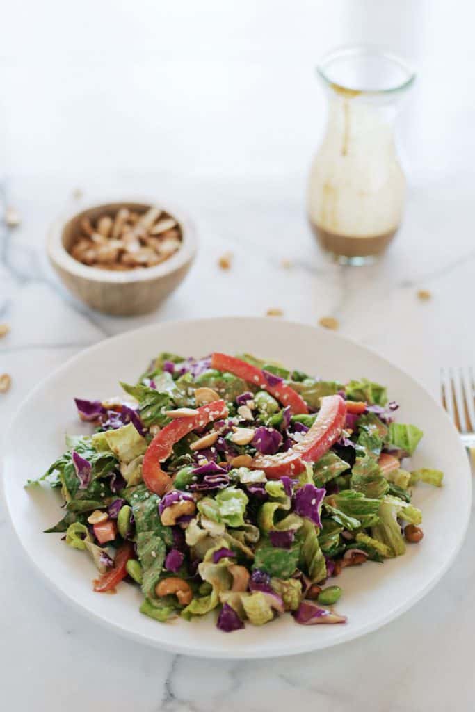 Creamy Tahini Chopped Salad makes two big salads or could be divided into four if served with an entrée. It’s made from lettuce, cabbage, bell pepper, onions, and cooked edamame.