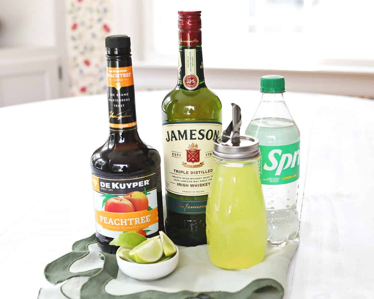 - In a cocktail shaker, combine the Irish whiskey, peach schnapps and sour mix with ice. I recommend doubling or tripling your recipe to make all the shots you need in one shaker.