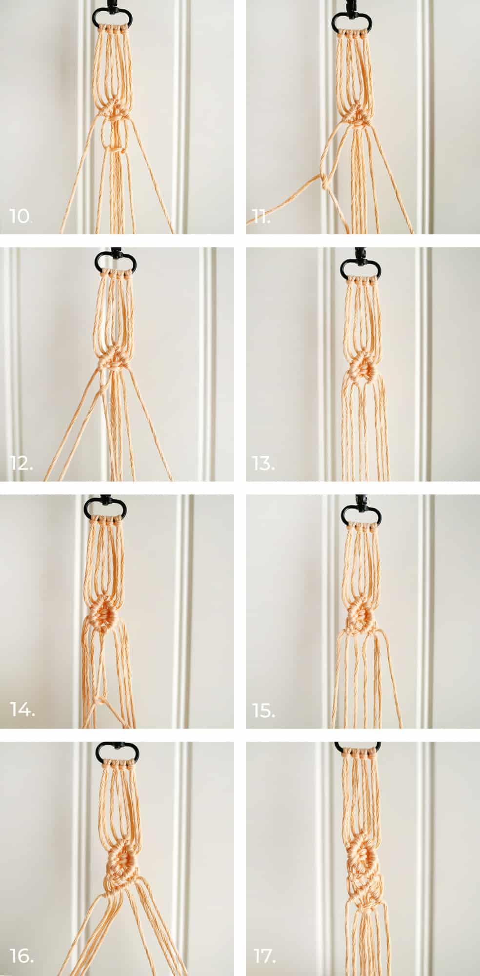 Step Sixteen: Start on your next diamond by using strand four to tie two half hitch knots over strand five, then repeat with strands three, two and one.
