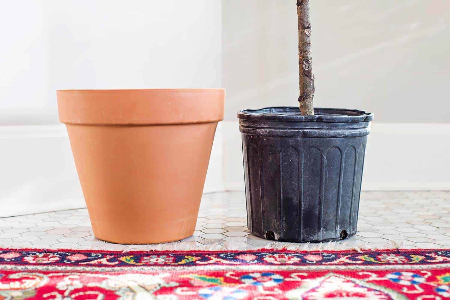 You bring a gorgeous fiddle leaf home … now what? Most of these trees come in thin/cheap plastic containers when you first purchase them. I like to take my tree out of these suckers as soon as I get home. For pots, I use good ol’ terracotta pots.