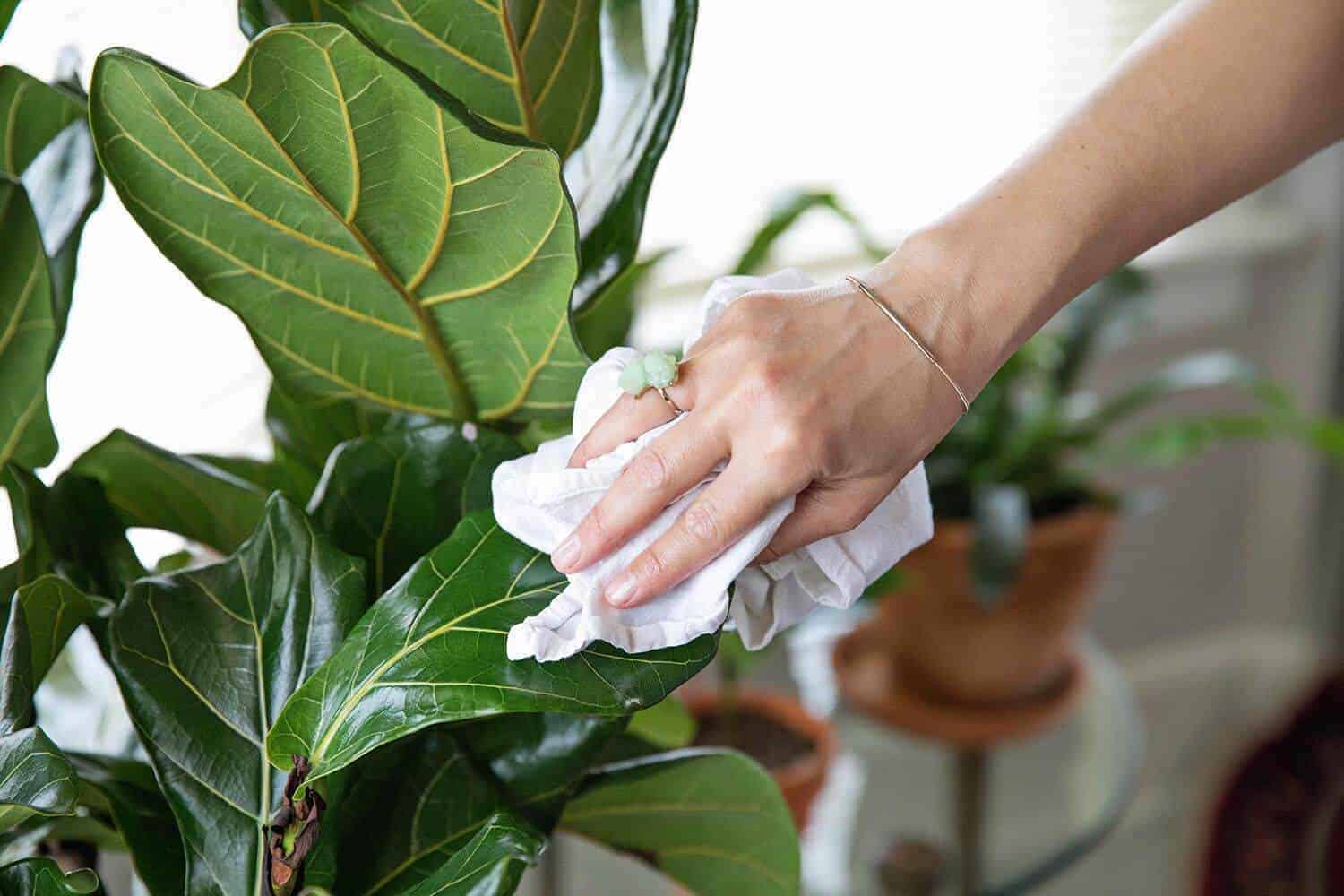 Every week or so, I wipe the leaves with a wet cloth and get all of the dirt and dust removed. After the leaves are cleaned, I use a leaf shine spray to make them extra glossy.