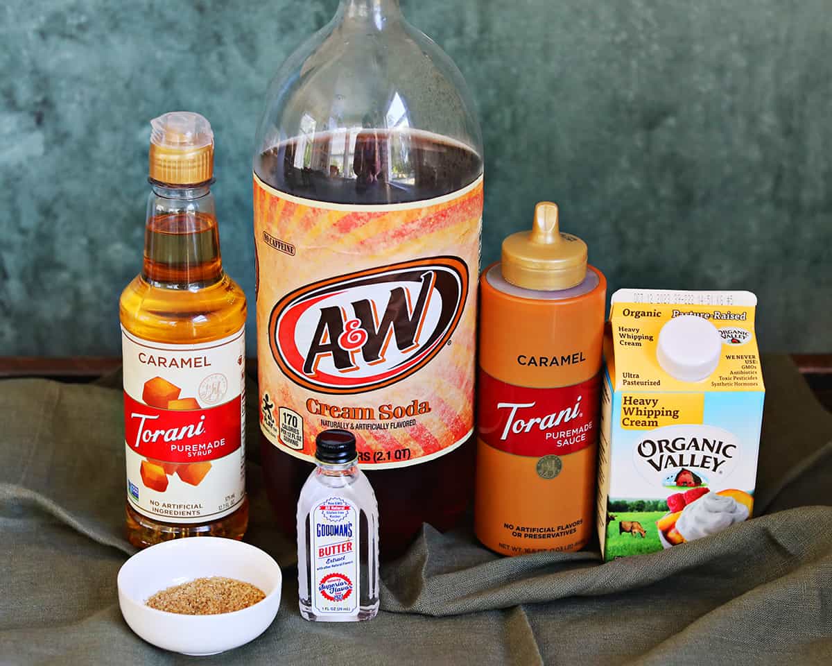 Begin by making the base of your drink (without the topping). Combine cream soda with butter extract and caramel syrup.