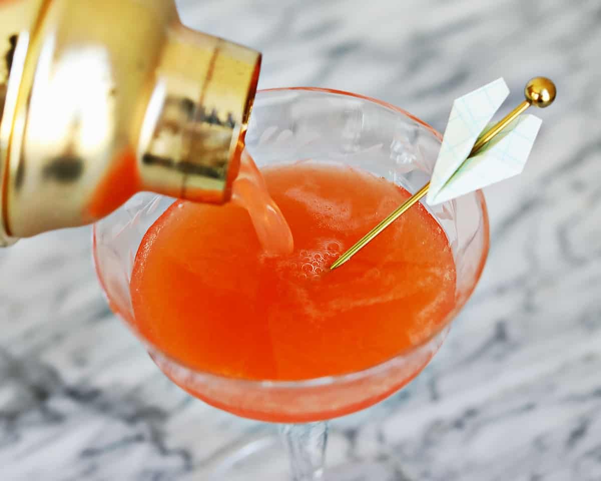 The best glassware choice for this cocktail is a coupe glass. I used a gold cocktail pick to secure my tiny paper airplane garnish.