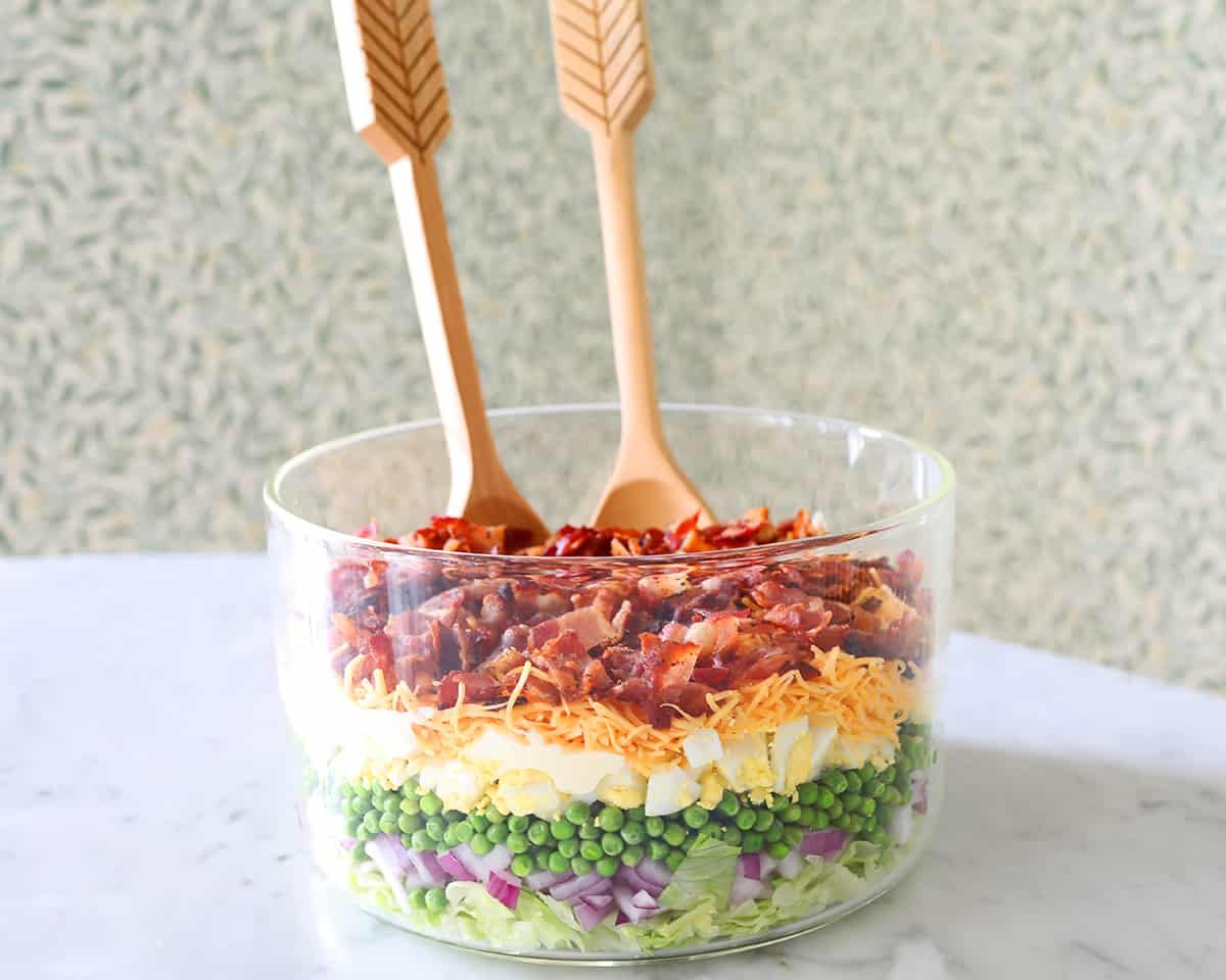- The 7 Layer Salad must be served in a glass bowl so you can see all the layers. It’s a very visually pleasing salad. I chose this glass bowl because it shows the layers really well. The salad is meant to be served without mixing the layers, so people can scoop straight down and get a scoop of all the layers.